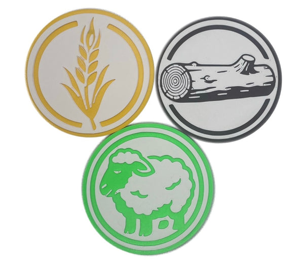 Bring a touch of classic tabletop strategy to your game nights with this set of resource-themed coasters, inspired by the materials commonly found in popular resource-management board games.