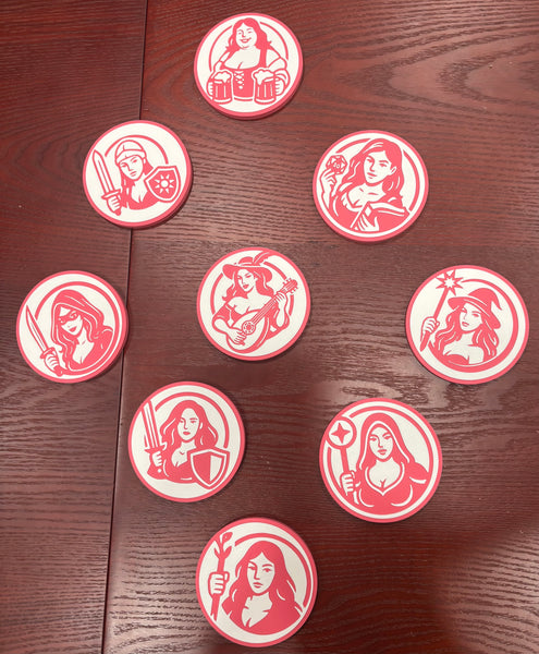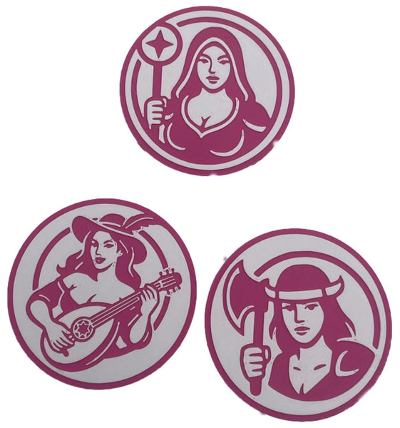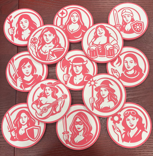 RPG Class Coasters — Choose Your Own Class & Colors | Female Adventurer Emblem Coasters | 3D Printed Tabletop Gaming Accessories